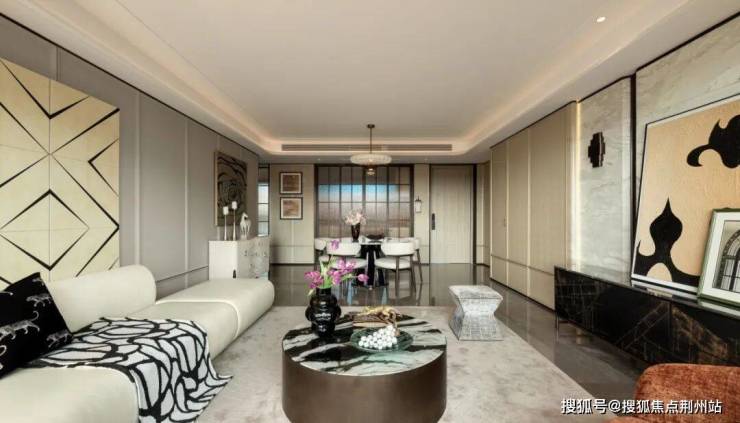 电视背景墙芬迪绿石材的自然肌理、影木饰面的温润触感、沙发背景墙的几何艺术感,不同材质交织出细腻丰富的空间层次,于现代雅居中静诉奢感。