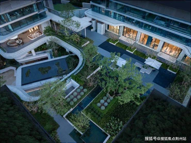 因项目整体抬高,从下沉庭院到架空层“空中花园”的落差极大,形成独特的峡谷地貌,杭序府的设计团队汲取九溪烟树为造园灵感,打造一个立体多维的城市溪谷交互园林;因项目毗邻江岸,杭序府的外立面以“站立的江潮”为灵感,大面积弧形玻璃与四层堆叠的石材线条,将钱塘江潮的千钧之力和流水之韵凝练于建筑肌理之中。