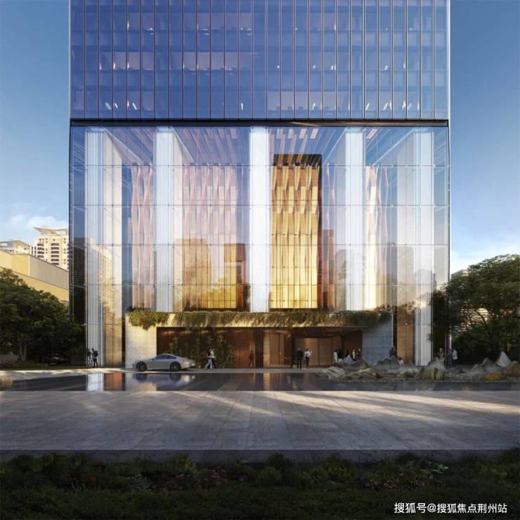 塔楼南北立面采用渐变幕墙,从底部纯净玻璃逐步过渡为上方金属编织肌理,呼应江水波光;东西立面则通过竖向遮阳肋条强化垂直感,顶部“门”形塔冠悬挑于江面,既与传统江心屿双塔对话,也象征温州开放的城市气质。