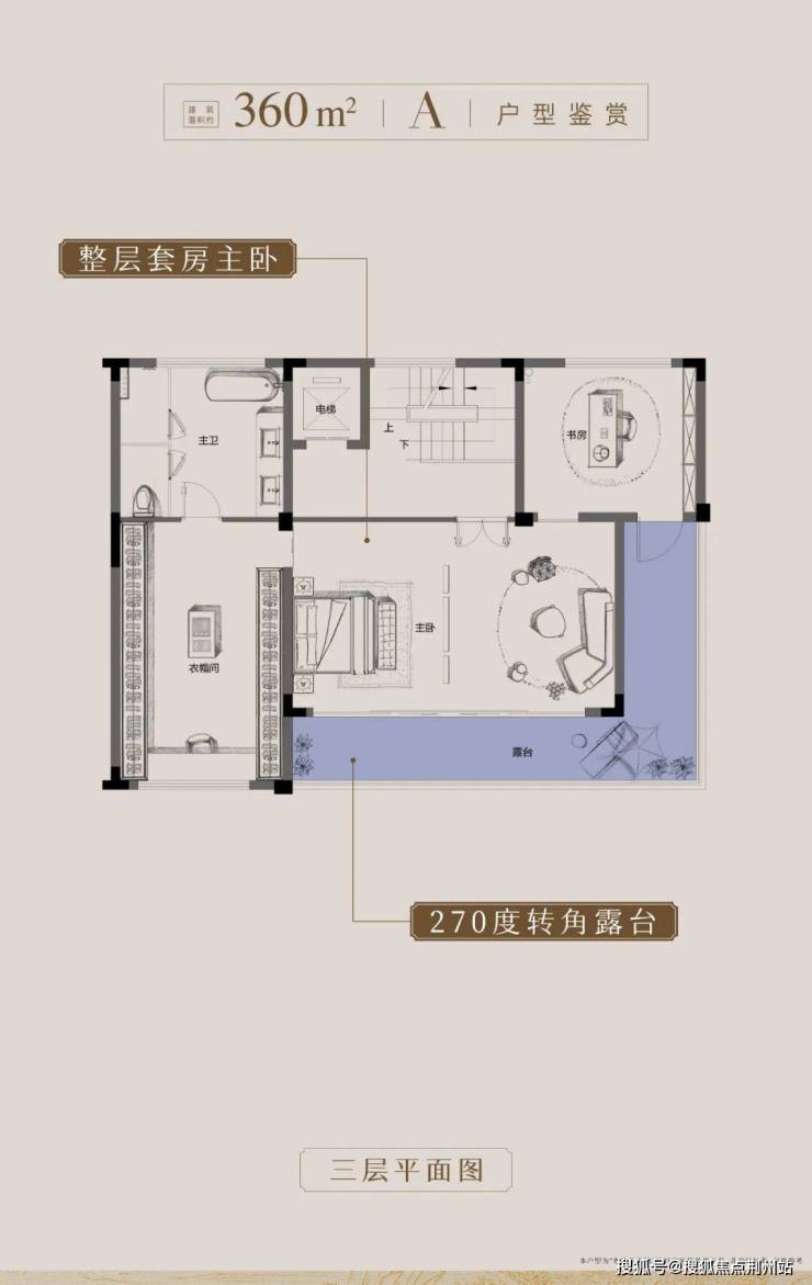 三层主人空间,敬呈义乌层峯人士——整层酒店式主卧套房,植入“主卧小家化”理念,设起居室、步入式衣帽间、独立书房等。同步,匠造270°环绕式露台,延展空间采光观景面,高定奢居范本。