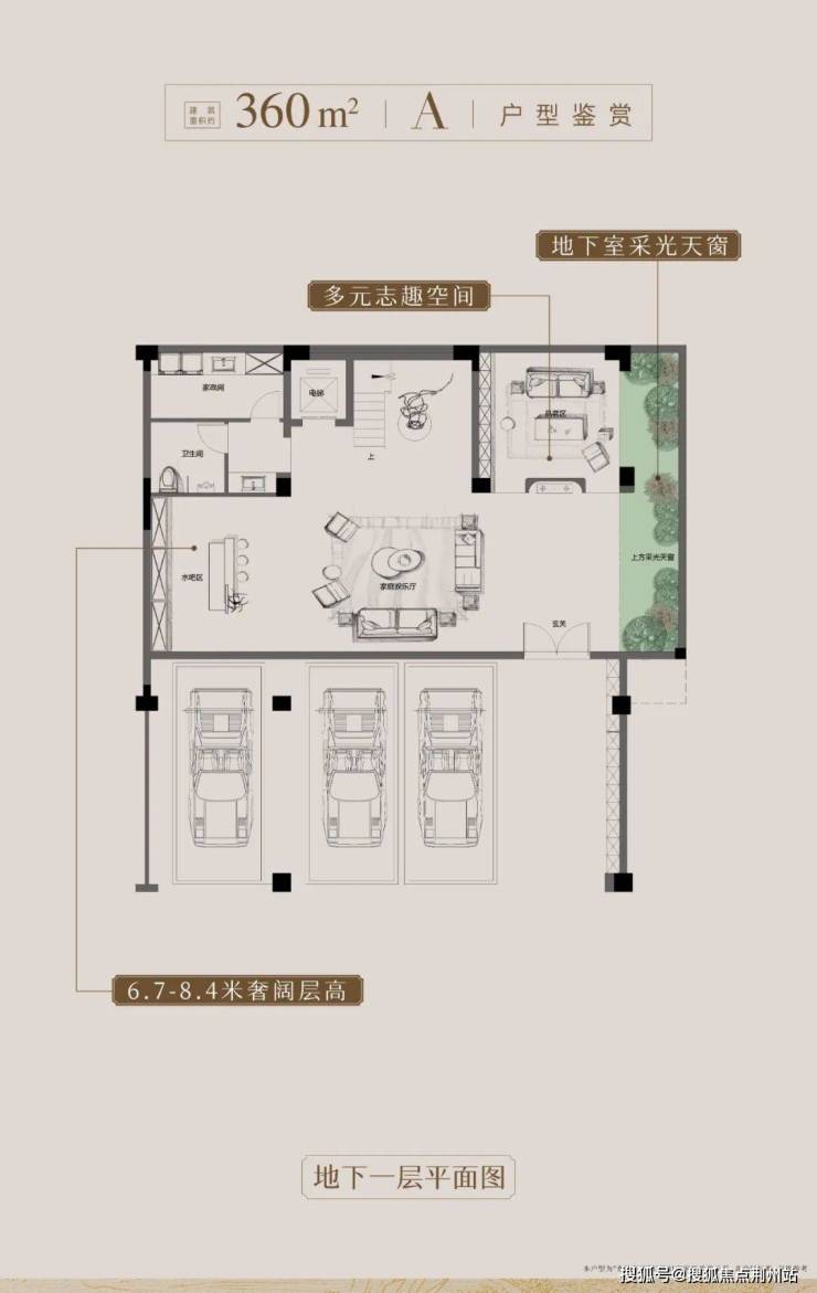 建筑面积约360㎡院墅的地下室空间同步迭新,相较市面上同量级户型地下室约5-7米层高,秦塘和颂升级地下层高至约6.7-8.4米,巧妙融合侧向采光天窗与下沉庭院双重采光系统,告别传统地下室的:狭小、潮湿、采光差等弊端。地下一层停车区域能够轻松容纳3辆爱车,尽显空间从容。未来,地下室空间更可随心打造私人酒窖、家庭影院等功能区,深度契合墅居生活的多元需求。