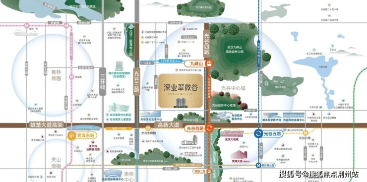 ◤一心◢ : 光谷黄金中轴,极萃光谷芯 经济轴:高新大道,世界光谷之脊梁主轴,聚集华为、小米等数百家行业龙头企业,已成为万亿级产业集群的“黄金大道”生态轴:光谷四路,毗邻光谷中央生态大走廊,是武汉市第一条城市生态走廊,更是大光谷的生态名片【深业翠微谷】毗邻高新大道与光谷四路,占据万亿级经济命脉与生态景观发展的"黄金十字轴芯",繁华与自然交汇地