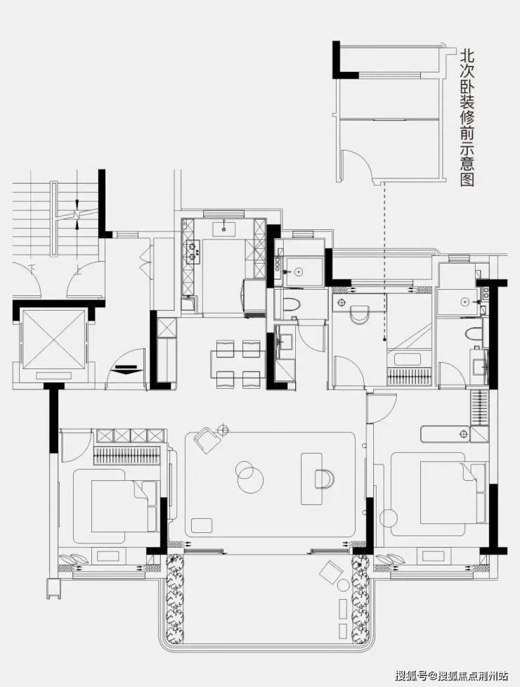 3室2厅2卫的布局,三开间朝南,比较大的两点是,这一户型还带有独立电梯厅。LDKG一体化的设计,形成一个超级大方厅,横向客厅约4.9米,连接约15平的空中大露台。
