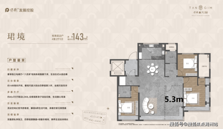 保利津门天珺标准层最大户型是四室三卫宽厅的169㎡,顶跃产品接近200㎡,纯改善定位无疑,未来会在实体楼呈现。目前样板间最大143㎡,同样是可变四室三卫,但升级了双套房。