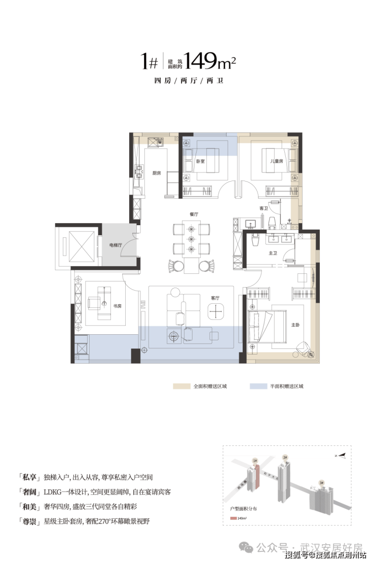 建面约149m²的户型设计为4房2厅2卫,在1、2号楼均有覆盖。全明户型,空间利用率高,浪费面积少,主卧配备独转角落地窗,采光和视野好。独立入户电梯厅,私密性强。不过从户型图上看,设计为房间环绕起居室的布局,可能存在空间上动静分区不明确的情况。