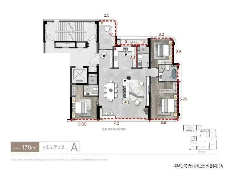 该户型建面约170㎡,南向面宽约14.75米,客厅开间约7米左右,空间尺度非常阔绰,居住体验可想而知,只可惜其“大面积、高总价”的门槛,却是让许多改善家庭渴望而不可及。