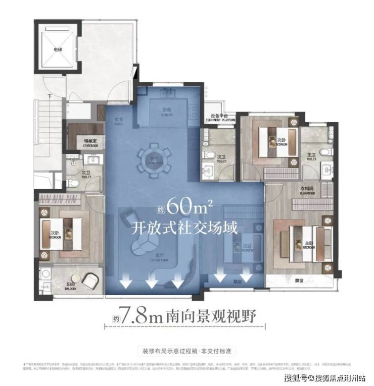 凭借约100%的超高使用率,该户型实现了正四房+双套卧+三卫+独立储藏间的全能功能配置,在市面上同面积段产品中,空间利用效率具备明显竞争力,能够满足改善家庭从二人世界到三代同堂的全周期居住需求。