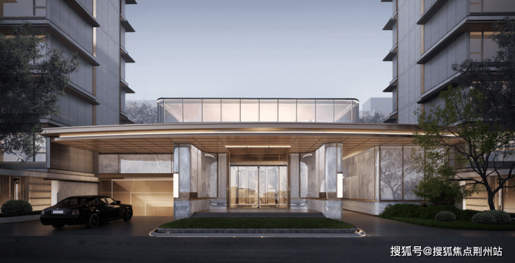 建筑审美高端酒店式大门 ,以大面积奢石、铝板、玻璃打造极具仪式感的城市玄关,将精致、隐奢展现得淋漓尽致。