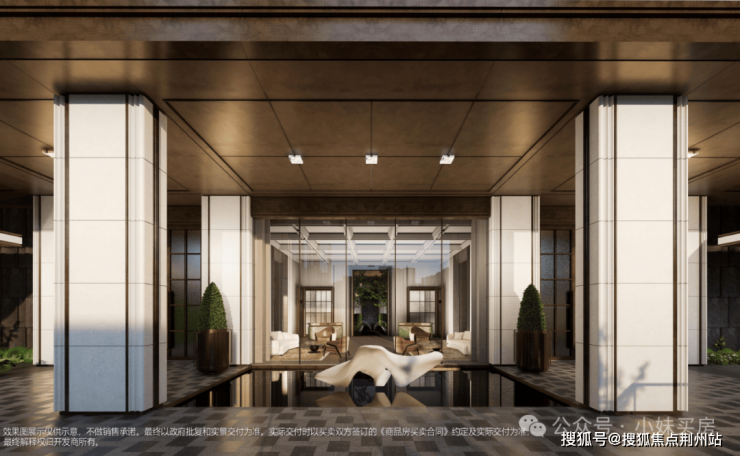 最核心的中庭景观,项目以西班牙故宫‘阿尔罕布拉宫’为灵感,呈现了极具仪式感的阵列式跳泉,幻影水台,水台中央矗立约1.9m高艺术雕塑。中心庭院打造天然贝金米黄大理石花池,更不惜成本全冠移植8株苍劲乌桕。