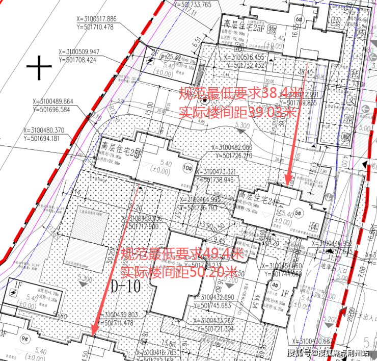▲部分楼栋间距示意。底图为项目报批文本,或有误差,以实际为准