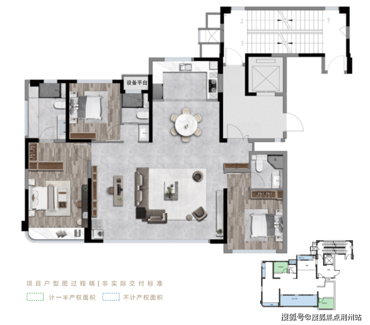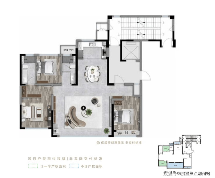 再看滨江壹号143方,南向面宽约13.65米,套内+赠送约114方(含阳台半赠送,不含飘窗,放置设备的设备平台不计入),实际得房率约为79.43%。