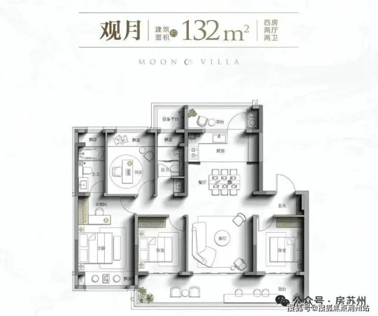改善洋房建面约132㎡,4房2卫,南向四开间,赠送近24㎡南北双阳台,堪称吴中城南入门级改善选择。