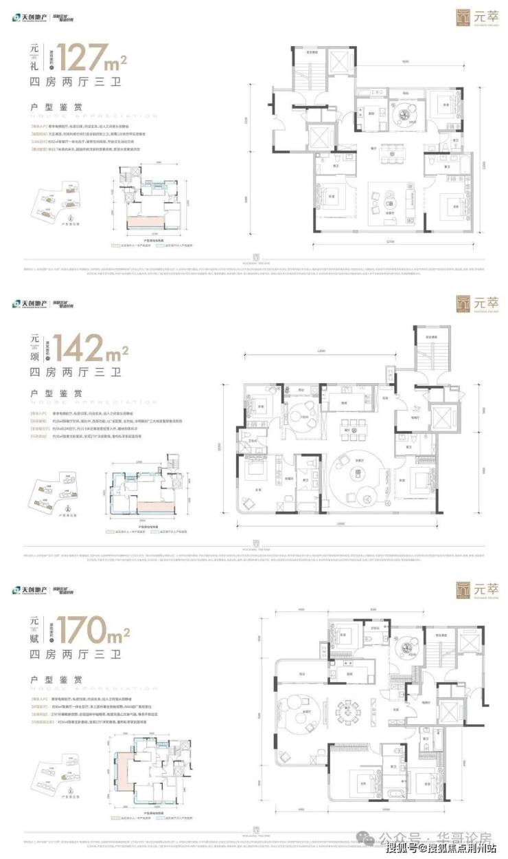 天创·元萃占地约1.18万㎡,总建筑面积约2.35万㎡,总户数159户,是“六小龙”中最小的一个,容积率2.0,由四栋10—13层的小高层组成,户型包括建筑面积约127㎡、142㎡、170㎡,全部为4房2厅3卫,毛坯交付。