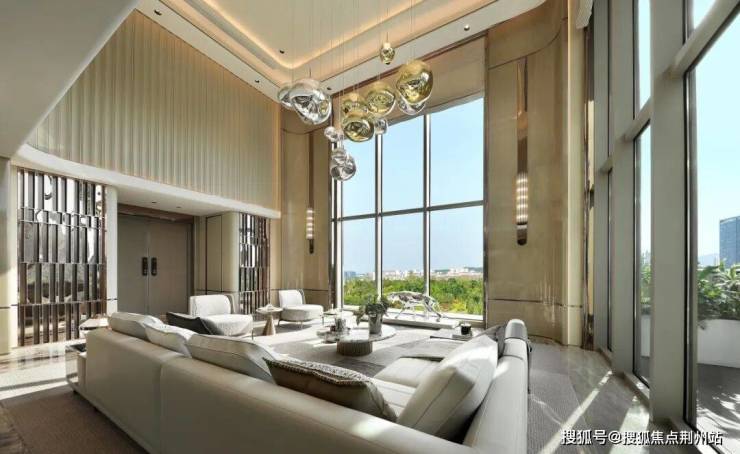 项目创新研发“空中平墅”产品,在横向面宽延展超20米的设计下,突破平面束缚向上延伸,打造了约6.6米挑空、200m³立体客厅,将别墅的垂直尺度与大平层的横向尺度融合,创造平层“墅居”的生活体验。