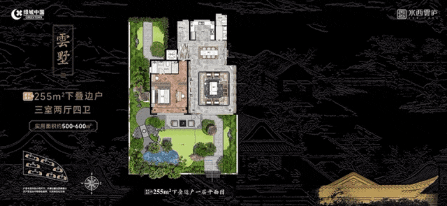 如果说归家礼序以层层递进的私密感构建内向场域,中央景观则以开放姿态铺展出一副山水长卷。