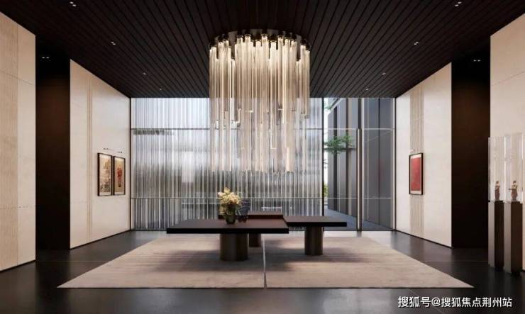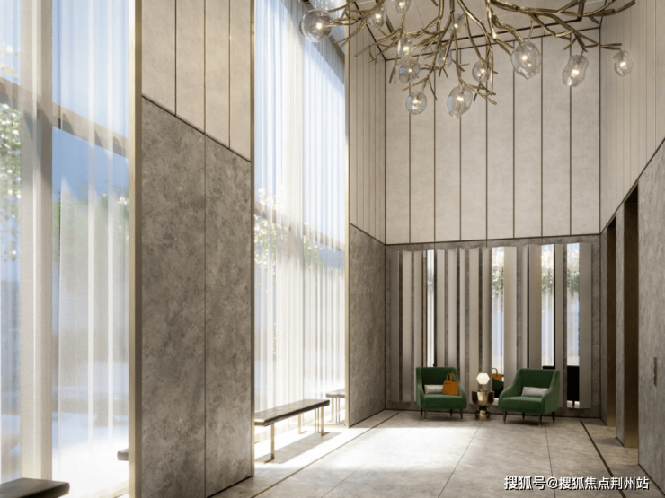 电梯厅层高较高,设计简洁而不失精致,大面积的玻璃幕墙让空间更通透,顶部的枝形吊灯搭配,充分体现了低调奢华的美学理念。