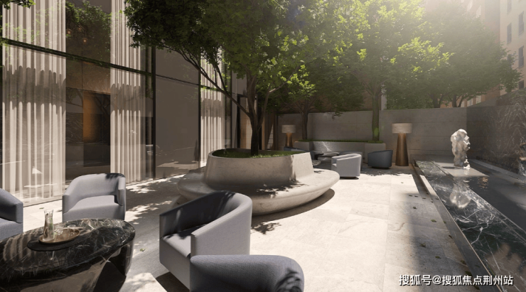 衔接大堂的雕塑花园,是一处结合艺术与自然的宁静休憩空间。花园内的大理石镶嵌水景成为视觉焦点,流动的水面与精心设计的雕塑相得益彰,营造出一个静谧且富有艺术氛围的环境。