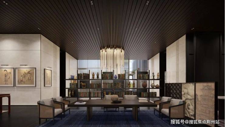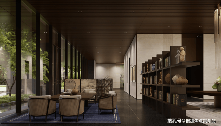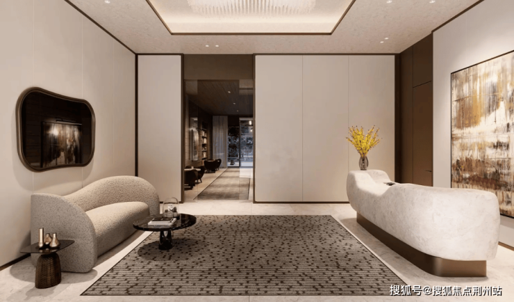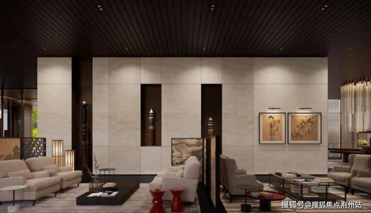 室内利用壁龛与开放置物架陈列艺术品,为空间增添了文化气息与艺术层次感,提升了整体氛围的品位和格调。南侧的景观与大堂内外的视觉延展,使空间与外部自然景观无缝衔接,模糊了界限,增强了空间感。