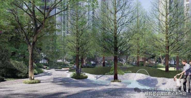 保利锦上印二期园林基于一期“一环·两轴·庭藏五境”的架构,植入了“烟火氛围、健康生活、全龄交互”的理念。它匠筑了“石之森、水之森、木之森、雾之森”四重秘境。