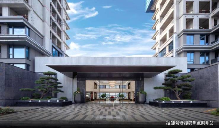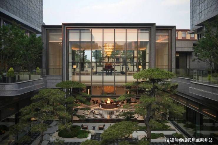 玻璃引光,静影沉璧,空间通透而意境深藏;门庭两侧,造型油松苍劲相迎,以迎客之姿,勾勒出归家礼序与画意。