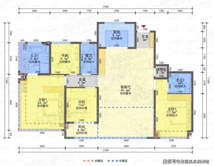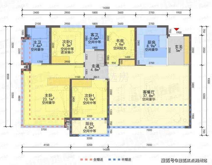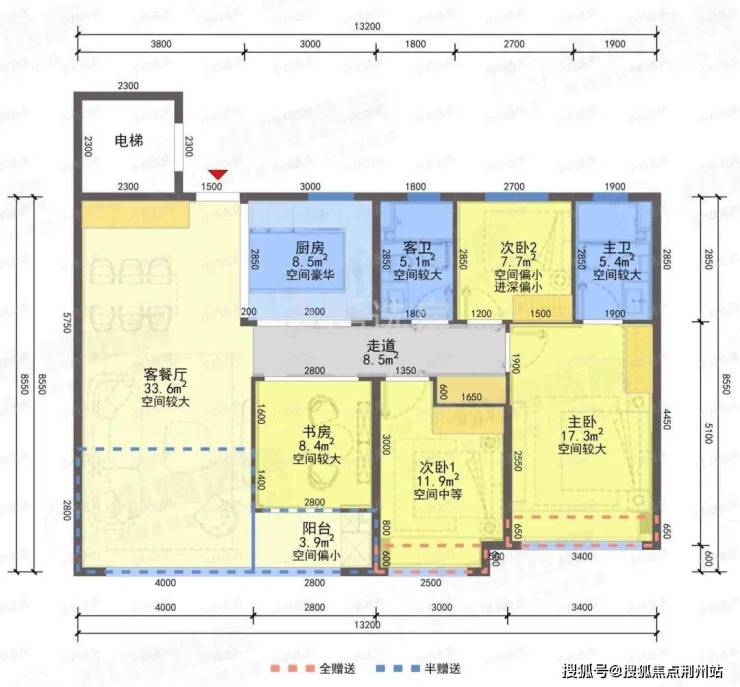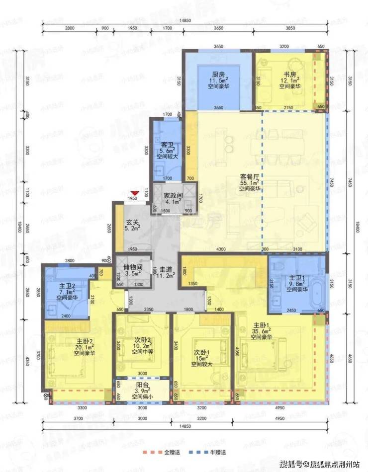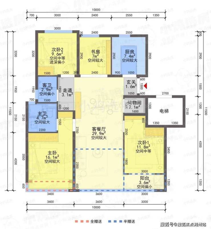 ❶建筑面积约110㎡户型,4房2厅2卫,含赠送得房率约91%。