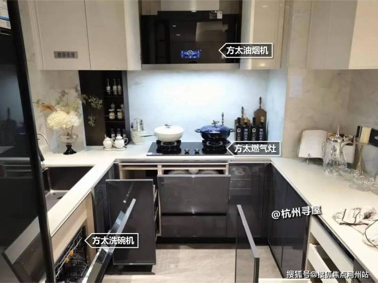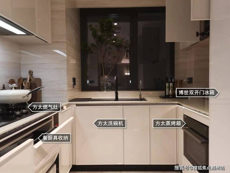 厨房配置基本相同,方太燃气灶、油烟机、洗碗机、大单槽、蒸烤一体箱、博世双开门冰箱。