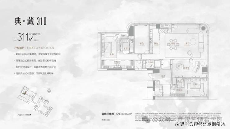 ”典藏310“尊享户型,以超80m²LDK超集聚场为核心,融合高奢酒店式行政套房设计理念,打造城市塔尖生活典范。约270°环景端厅尽揽城市风光,无拘开放式中西厨让全球珍味触手可及。3+1房两厅三卫布局,起居室、衣帽间等功能区一应俱全,满足高端居住需求。