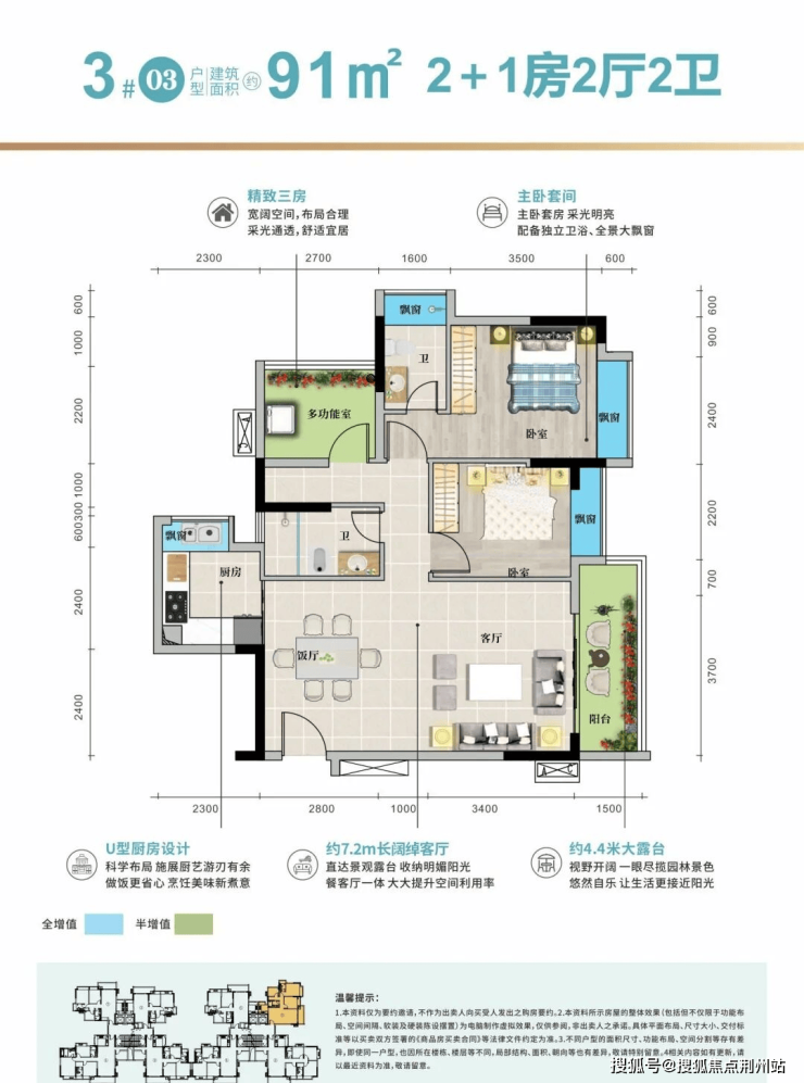 3#03户型:约91㎡2+1房两厅两卫(三房带主套+双卫浴)