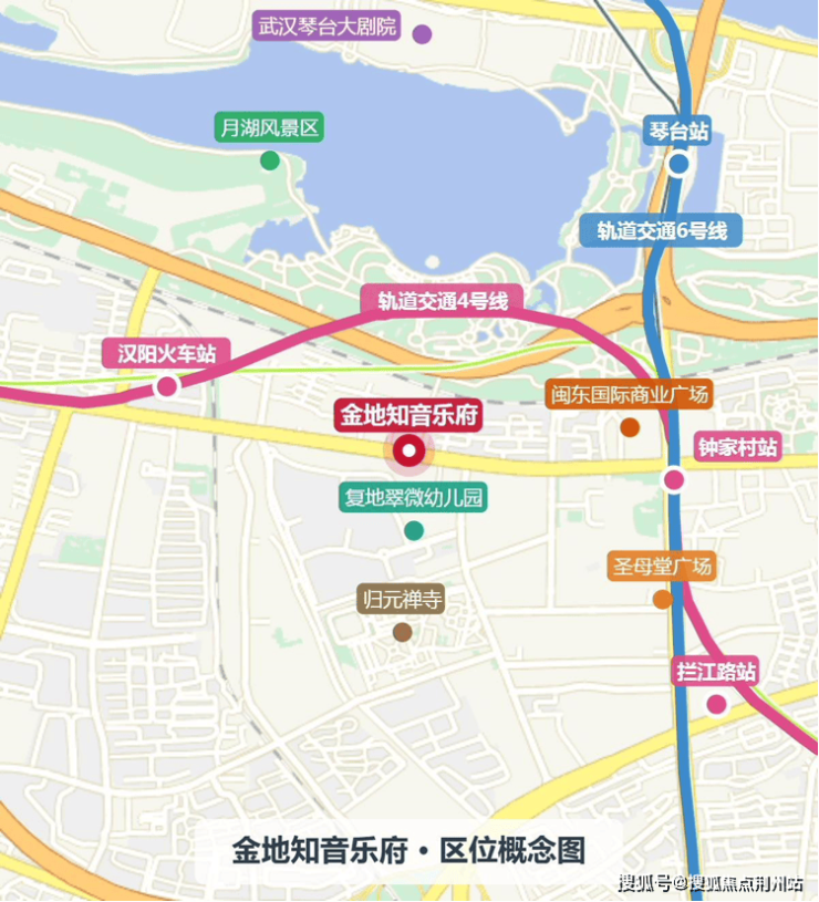 项目地处汉阳大道以北、车站横路以西,紧邻汉阳核心板块钟家村,这里是汉阳传统的商业中心,也是武汉三镇的交通枢纽之一。知音乐府距钟家村地铁站(4号线/6号线换乘站)约600米,步行10分钟即可到达。 此外,琴台站、汉阳火车站、拦江路站均在1公里范围内,轨交出行非常便利。
