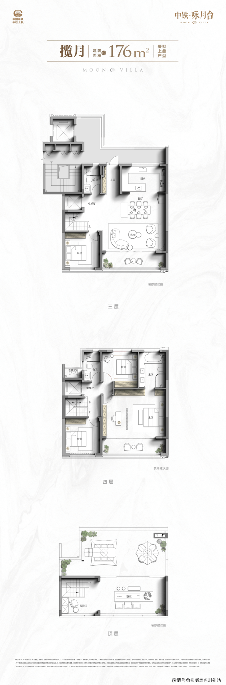 上叠建面约176㎡,客厅挑高,南北双露台+星空屋顶露台。