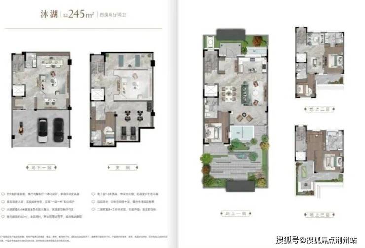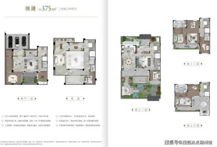 建面约245-287-295-365m²的合院:3层设计,层高3.1-3.5米,户户配备独立庭院。