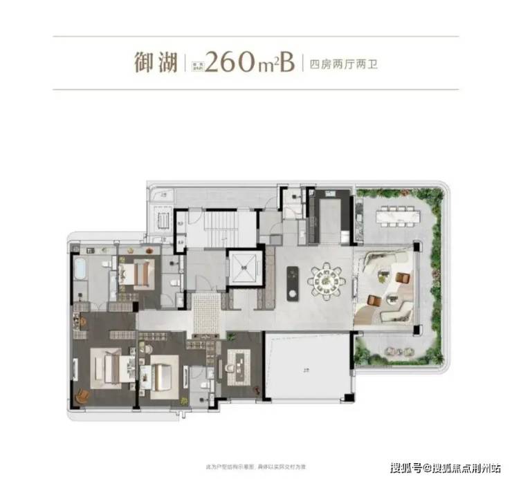 建面约260㎡偶数层户型:与奇数层设计相差不大,只有客厅开间和露台位置不同。