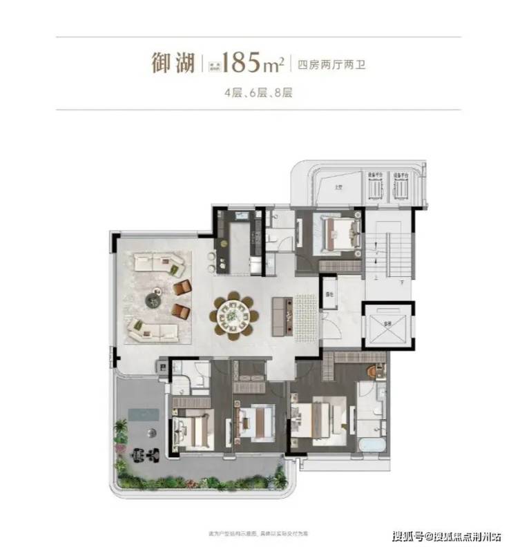 建面约185㎡的户型:约14.8米南向面宽;回游动线+专属门厅;中西双岛台+空中花园大露台。