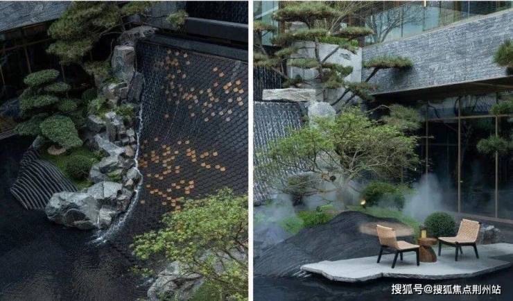 “天地院落”以超5米的鎏金龙鳞跌瀑为视觉焦点,黑松、羽毛枫与拙朴山石错落其间,构筑了一个充满禅意的美学空间。在这里,能瞬间从城市的喧嚣中抽离,感受“天人合一”的宁静。