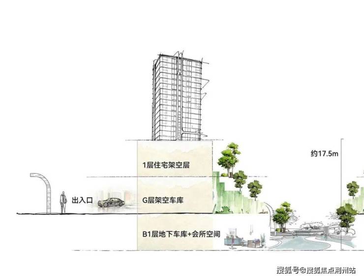 3、项目为新规后的“抬地式”设计,地面之下是峡谷绿洲,上面是纯粹的庭院花园。住宅整体抬高约11.5米,相当于普通住宅约3-4层的高度,视野和采光极大提升。同时,将部分车库设于G层地面,实现「花园式」停车场,业主下车即可步入景观花园。