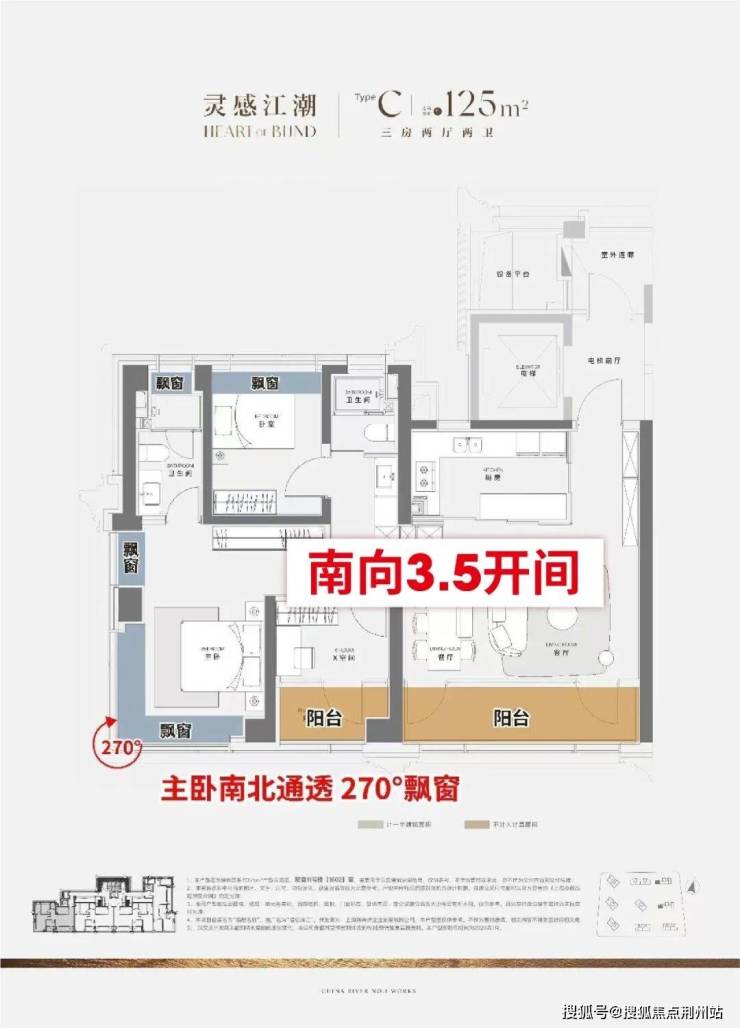 南向3.5开间+双阳台+270°转角飘窗,让该户型的采光性能、空间通透感几乎做到极致!