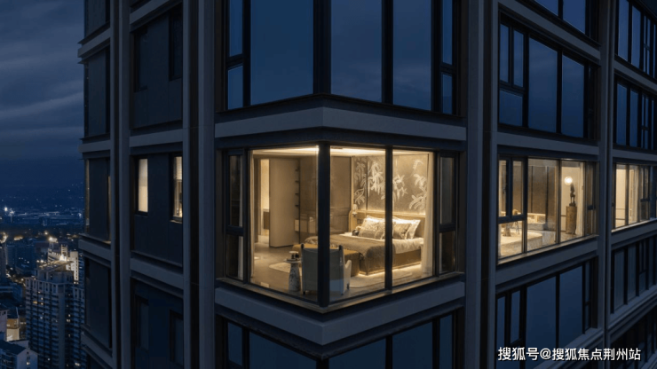 建筑外立面对标美国纽约公园凉廊,基于大都会的设计手法进阶,主体笔直硬朗、形点缀,优雅中蕴含奢华。采用类公建大面积玻璃幕墙,搭配金属铝板和真石漆涂料,顶部采用雅奢鎏金塔冠造型,打造出极具现代都市感的建筑外观。