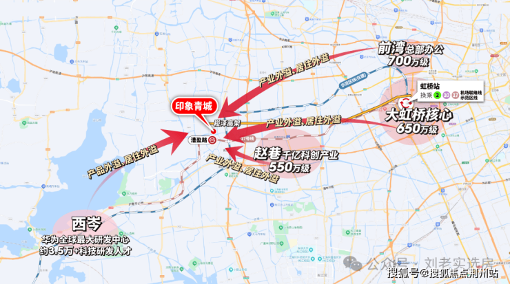 但这还不是全部,17号线+示范区线左手长三角一体化、华为,右手前湾、大虹桥总部商办,并通过虹桥枢纽,串联2号线及正在试运营的机场联络线,把市中心、徐汇、闵行、张江等高能板块都纳入印象青城的通勤版图。