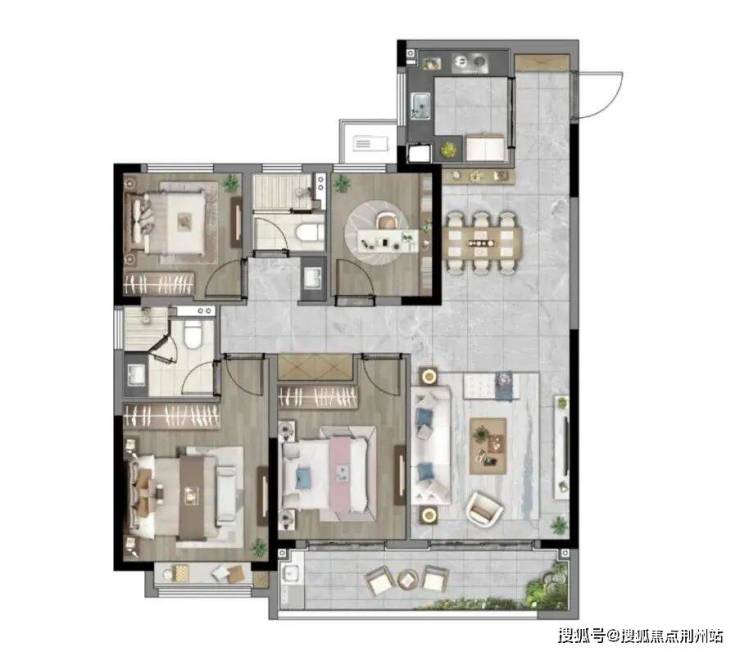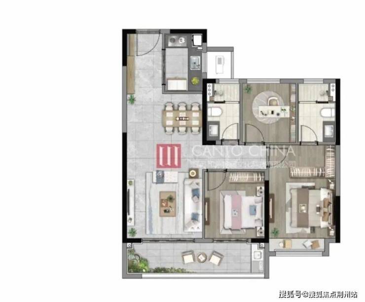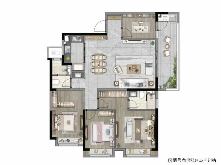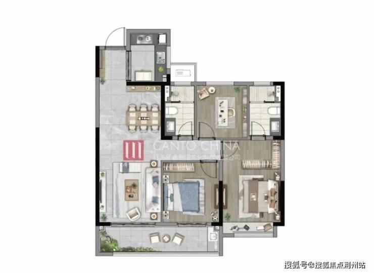 建面约116㎡,3室2厅2卫。该户型与起步户型基本一致,在空间尺度上作了提升,南向次卧及北向书房都更为宽敞,舒适度更高。