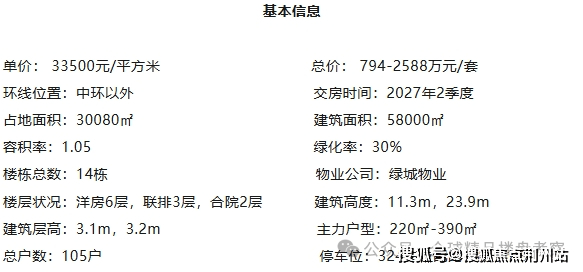 共14幢105户,合院联排12幢57套,洋房产品2幢48套,其中联排总高3层有270平(26套),310平(17套),合院335平(6套),365平(3套),390平(4套)最后一排是两幢总高7层(一楼架空)的洋房共48套。