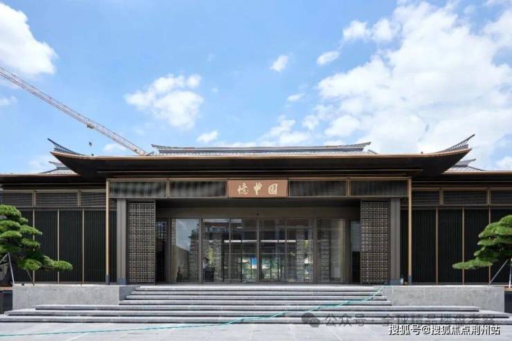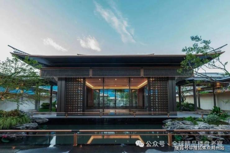 低层合院层高3.2m,南北通透,通过采光天井、全景落地窗优化自然采光与通风;立面采用浅灰色石材干挂+深褐色铝板干挂,屋顶采用装饰格栅+屋脊装饰构件等,中式风格。