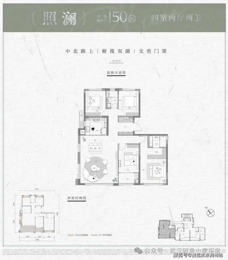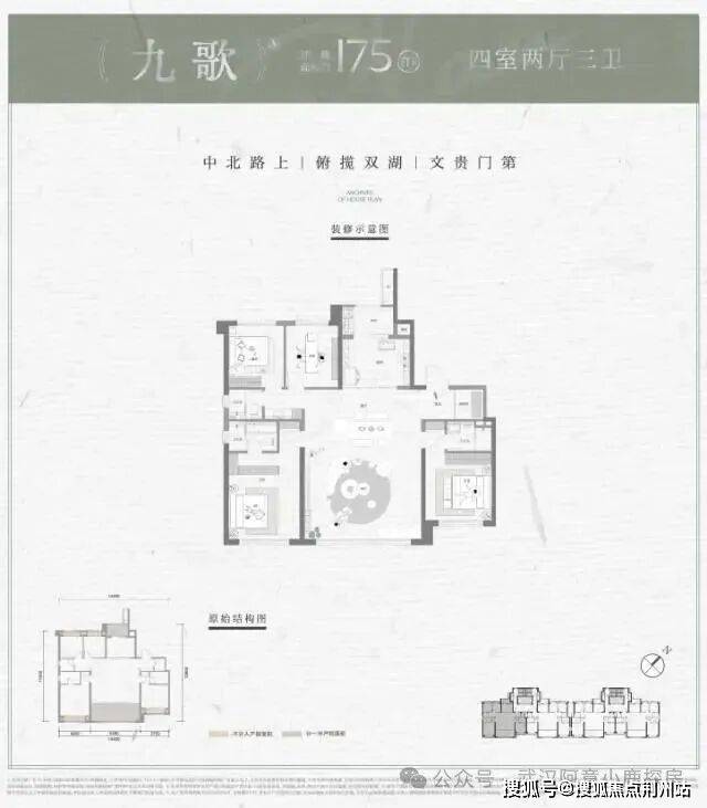 四房两厅三卫,3开间朝南,四个房间分列与户型3个角,主卧和次主卧均挨着客厅,动静分区不佳。次主卧所带卫生间为暗卫。该户型结构非常常规,只能说中规中矩,想象力不足。