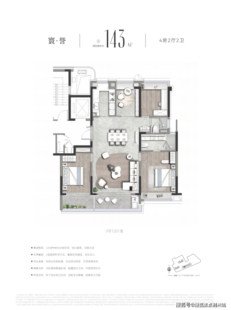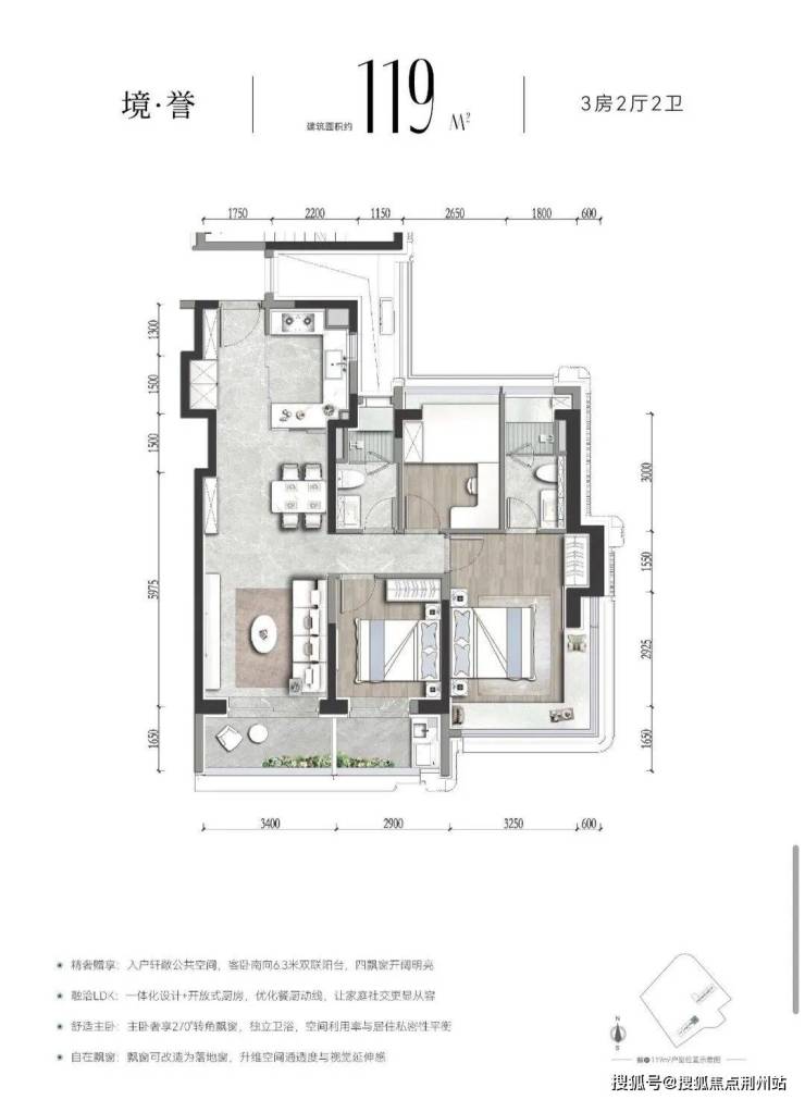 :洄游式270°采光大横厅设计,北向飘窗可升级为全落地窗,搭配东面270°景观阳台,形成环幕通透格局。三卧室朝南的“平权采光”设计,匹配二胎或三代同堂家庭需求。北次卧“X空间”可灵活变装书房、儿童房,适配家庭成长周期。主卧配置独立化妆间、南向景观阳台、私卫的套房配置。