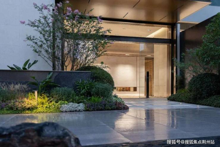 强调品质与细节的前场景观揭开了归家序幕。迎宾涌泉在水面泛起涟漪微波,爱马仕灰大理石景墙与精致品牌案名在材质质感、肌理等方面形成多重对比,共同构成一幅相得益彰且有张力的归家画卷。爱马仕灰大理石搭配极具质感的仿铜色造型铝板肌理,结合暖黄色灯光流泻,充分彰显精奢雅致的归家礼序,营造定制化的归家场景。