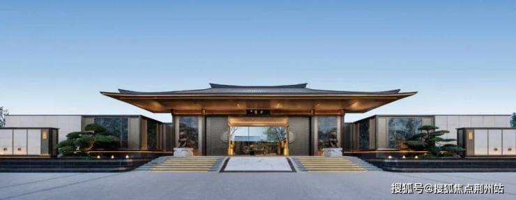 两侧层叠的迎宾水景从涌泉蔓延到石阶纹路。周礼中强调的对称和威仪,由两株青翠松柏、价值百万的蓝翡翠奢石和600斤重的威武铜狮分列在左右。
