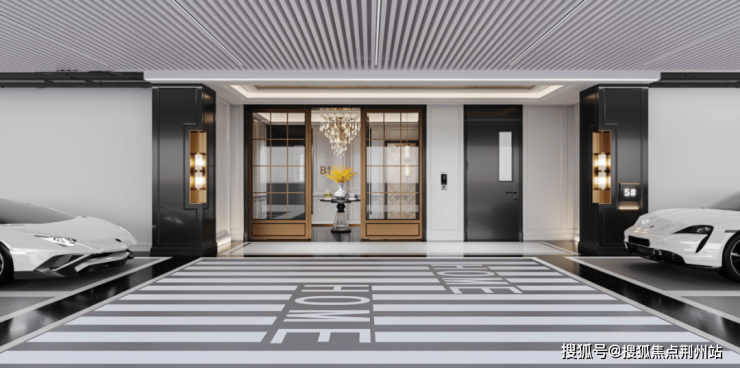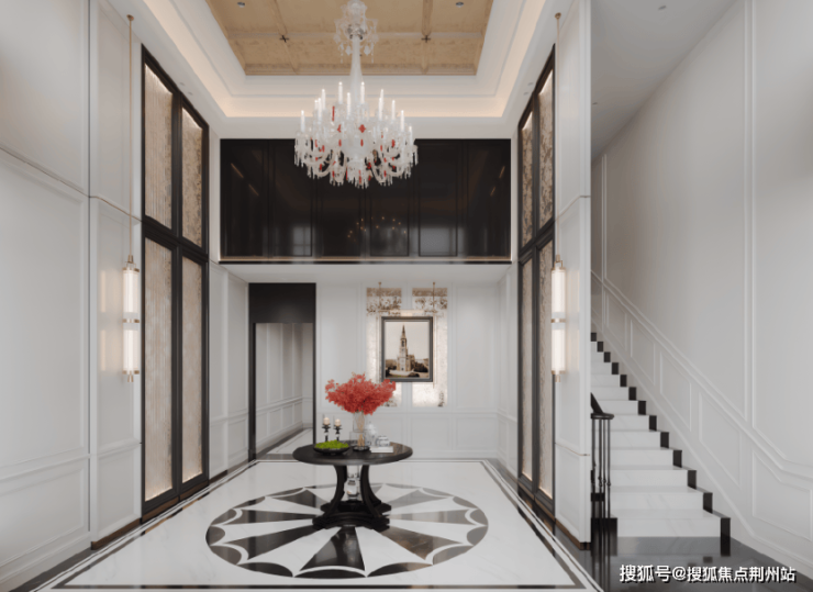 在公区的打造上,美古花园将钢琴白、玄雅黑、明媚金等色调搭配出特调的“大师美学”,将奢华酒店感融入每个角落。首层大堂及地下大堂,璀璨、复古而又不失庄重。石膏板金箔吊顶,百叶、柜体、墙面和踢脚线均为黑色木烤漆,又以金箔描金勾勒墙面,还有黑色木烤漆雕花作为点缀,黑金主色调诠释高级感。地面采用黑白根雅士白拼花,黑白相间致敬经典。吊灯和壁灯也都是酒店风格的水晶灯,演绎水晶的璀璨风尚。搭配造价不菲的软装设计,这不仅是归家大堂,更是城央艺术馆。