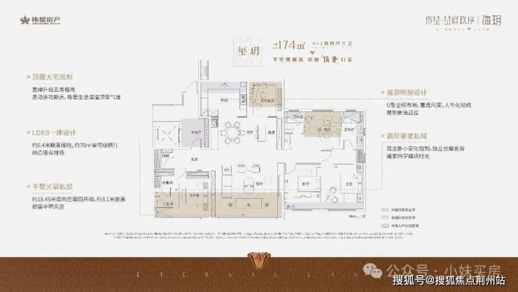 建面约174㎡户型,做到了约 18.45 米南向巨幕四开间,约 70㎡豪宅级横厅。
