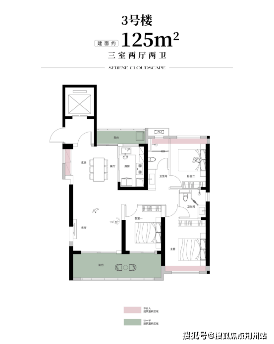 建面约125m²3房2厅2卫户型,在建面120m²以内面积的基础上进行针对性升级的优化之作。整体保留了动静分明的成熟格局,同时通过关键调整提升了居住舒适度,主卧不再连接阳台,从而增加了实际可用面积,居住体验更为宽敞从容;北向增设独立生活阳台,实现了家政晾晒与客厅观景的功能分离。这些改动在控制总面积的同时,显著强化了户型的实用性与品质感。