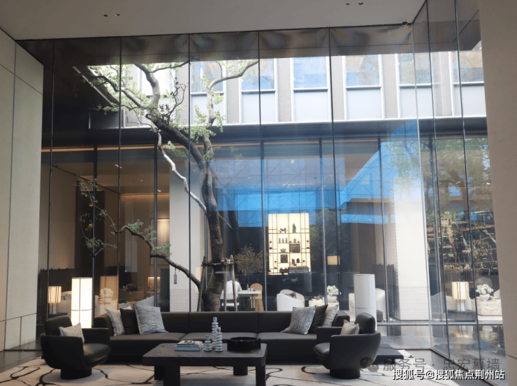 润玺示范区的接待休憩区以全景落地玻璃幕墙为主,不仅引入充沛自然光,更将室外景观无缝融入室内视野。宾客在交谈间隙抬眼即见庭院绿意与水系灵韵,通透敞亮的空间模糊室内外界限,延伸出开阔的视觉纵深感;光影随日光流转的韵律,进一步烘托出舒缓身心的雅致氛围。