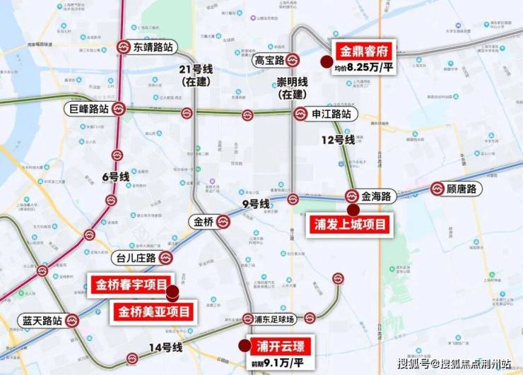 浦发上城地处金桥板块边缘,与曹路板块接壤,但价格参考上则应参照金桥的价格梯度。与浦发上城相差12号线1站路(申江路站)距离的金鼎阅府于今年3月入市,均价7.95万/㎡,两者单价相差约1W;沿14号线2站路(浦东足球场站)的浦开云璟均价8.95万/㎡,单价相差约2W。
